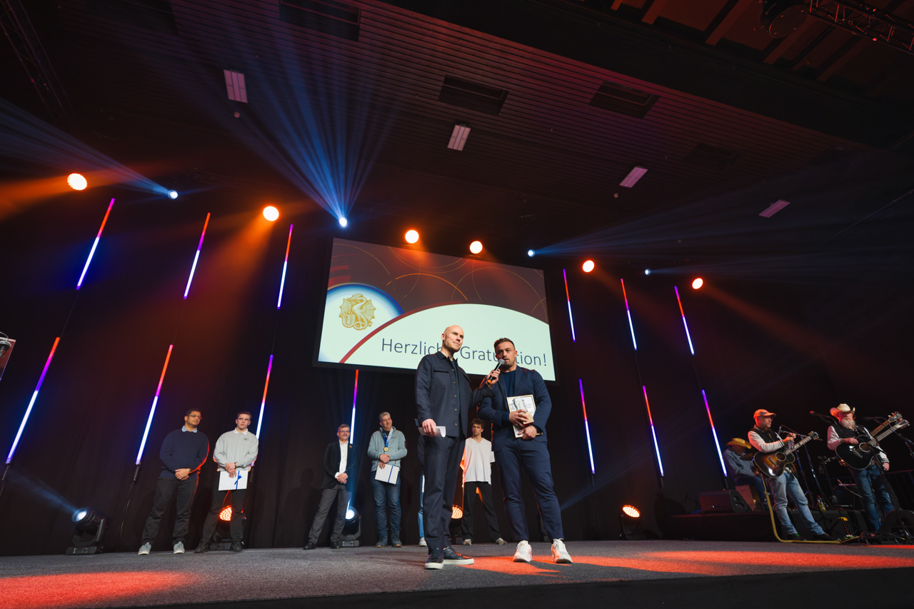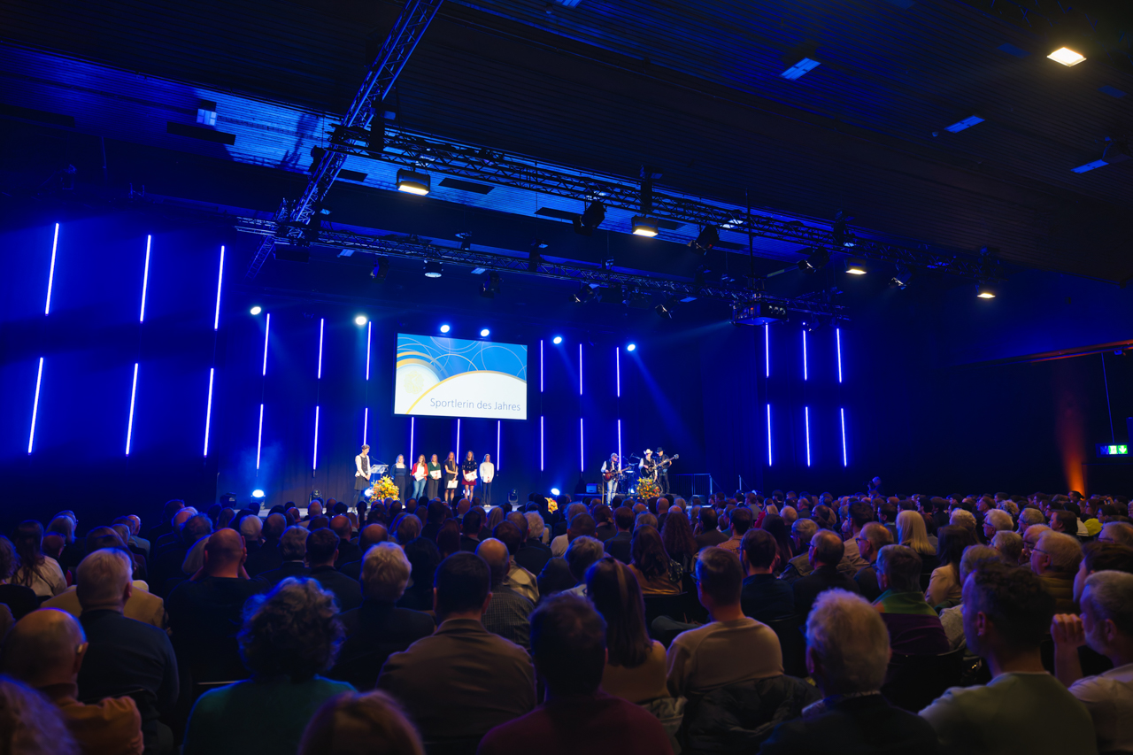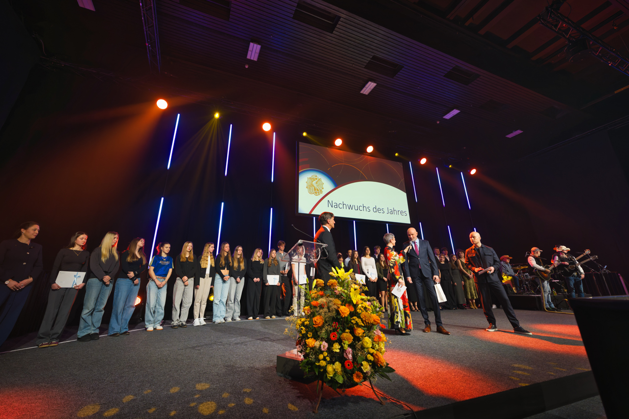 Unser Job dabei war auf der einen Seite ganz schön nervenaufreibend: Ein Sieger-Jingle hier, ein Intro da, dann wieder eine Einlaufmusik während sich Athletinnen und Athleten nach ihrer Ankündigung zu ihrem Auftritt auf die Bühne begeben. Alles natürlich möglichst sekundengenau passend mit Moderation und Video- oder Sound-Einspielungen durch die Regie. Nebst ein bisschen Stirnrunzeln und prüfenden Kontrollblicken ins Drehbuch, das hinter uns auf dem Bühnenboden ausgelegt war, hatte unsere Aufgabe aber auch eine unübertreffliche Sonnenseite: Wir konnten die gesamte Show und sämtliche geehrten Persönlichkeiten hautnah von der Bühne aus miterleben, sie standen schliesslich alle neben uns. Oder wir neben ihnen. Naja, manchmal standen wir auch neben uns…