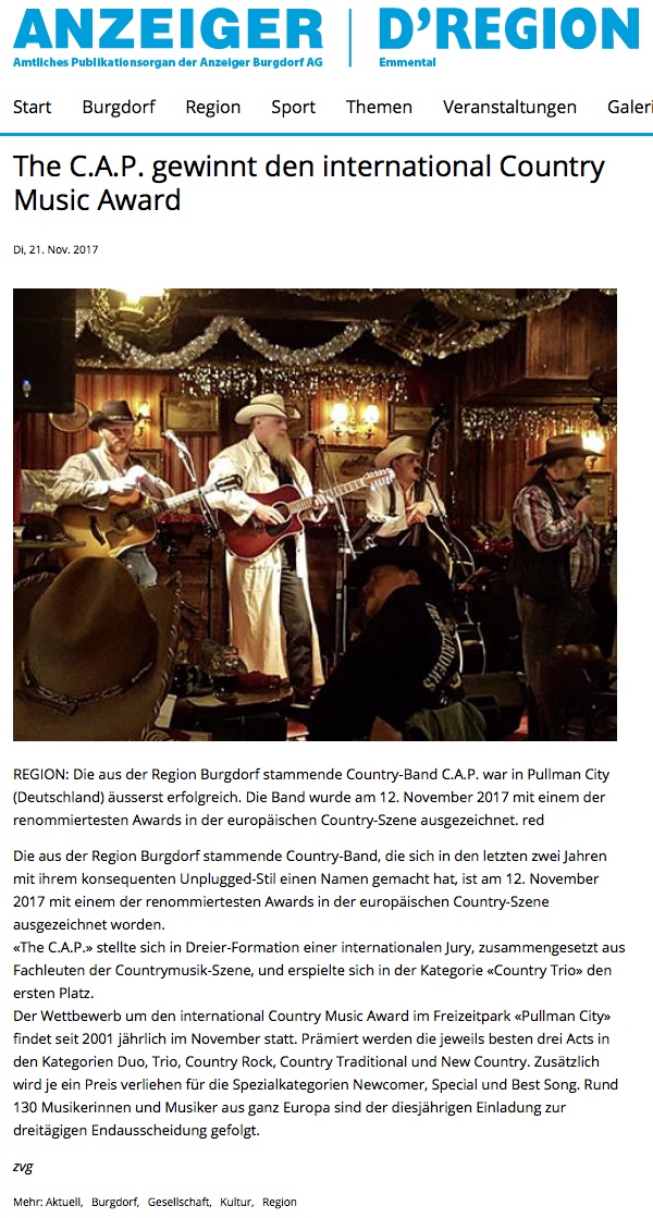 15.11.2017 – The C.A.P. gewinnt den international Country Music Award 2017 in Pullman City (Passau, D).