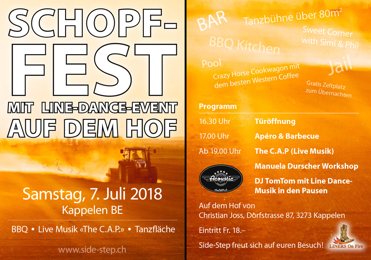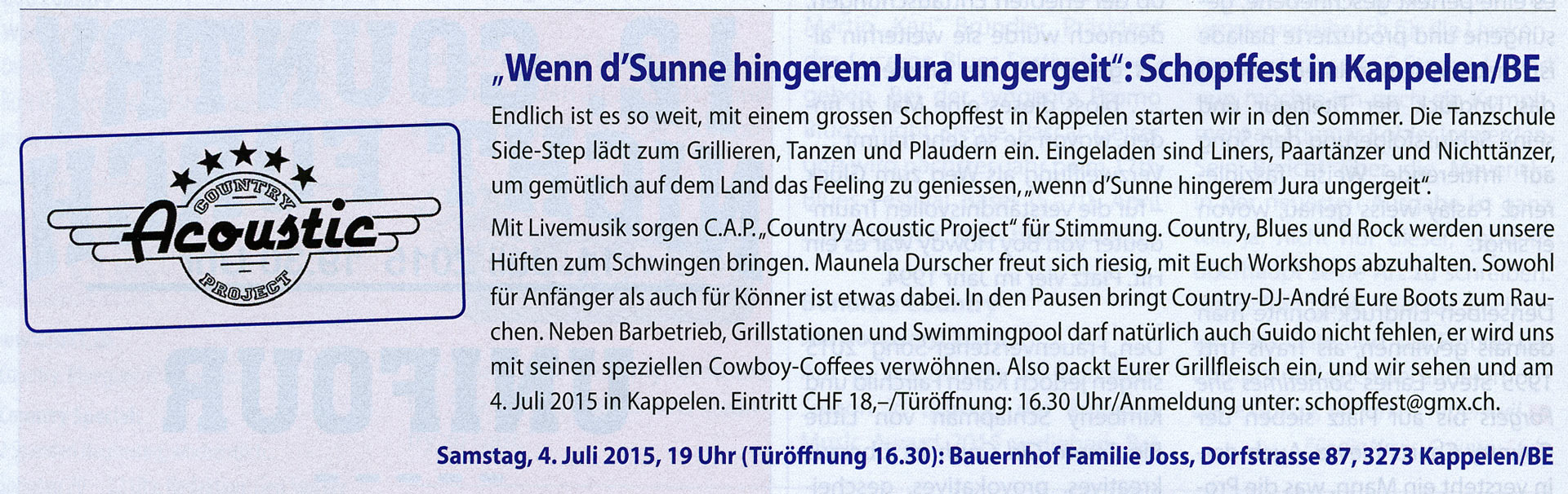 Lange haben wir uns auf dieses Fest gefreut, die grosse gemütliche Sommerparty auf dem Hof von Chrigu in Kappelen. Alle waren da: Der grosse Grill, das Gefängnis und die Sheriffs, der Crazy Horse Cookwagon mit dem hinterlistigen Cowboy-Kaffee, die Stände für stilechte Westernkleidung, der Country-DJ, die Linedancer – es hat rundum gepasst. Das Wetter war zwar nicht durchgehend bilderbuchmässig, aber immerhin hatten wir keine Sonnenstiche zu beklagen…